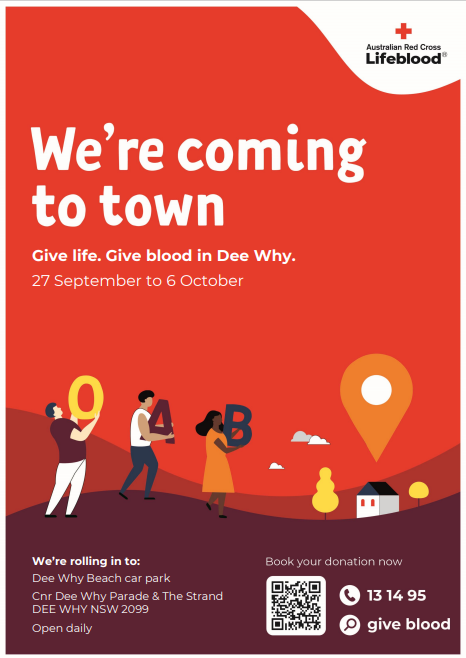 Got a bit of time next month? Time to give blood and change lives? 1 in 3 people in Dee Why will need blood, and they need people like you to give it. We’re rolling into town from 27 September to 6 October. Don’t forget to pre-book your spot at lifeblood.com.au, on our app or on 13 14 95.
