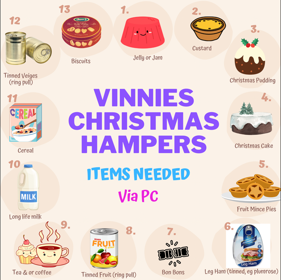 Next week marks the beginning of our Vinnies Christmas Hamper Appeal. Stella will be driving participation in this venture through the Pastoral Care classes.