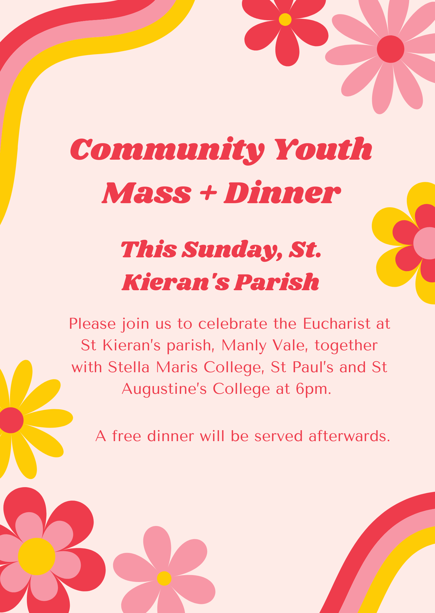 A warm invitation is extended to attend the Community Youth Mass at St Kieran's Parish this Sunday from 6.00pm.