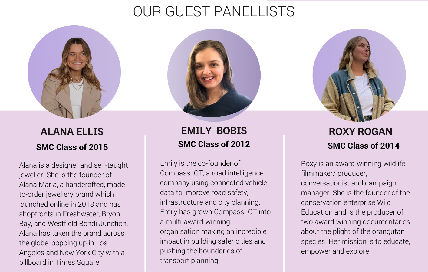We have assembled an outstanding panel of young, inspirational alumni in Alana Ellis (SMC Class of 2015), Emily Bobis (SMC Class of 2012) and Roxy Rogan (SMC Class of 2014) who will share their stories about what drives them, how they've set themselves up for success and how our own Stella students can be part of the journey to accelerate progress for women everywhere.